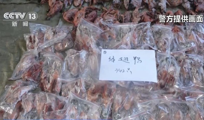 2025年,湖北警方打掉54人非法捕杀候鸟团伙。图为查获的部分受害鸟类。图片来源:央视